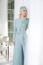 Step into elegance with our exquisite jumpsuit, designed for memorable occasions. This stunning piece features intricate stitching and matching crystals that create a captivating vine-like pattern, flowing from the shoulder all the way down the leg. The jumpsuit is complemented by a beautifully draped overskirt that starts at the waist and cascades down, enhancing the look with a graceful, flower-inspired silhouette. Perfect for making a statement at formal events, this jumpsuit combines sophistication with a touch of enchantment.